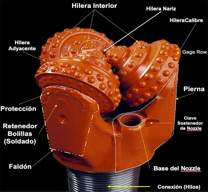 Los conos de las brocas triconicas (3) son elementos importantes para proporcionar el ángulo correcto para las diferentes tipos de roca o litología existente en las minas, estas pueden ser rocas blandas, medianas o duras, cuidar el offset en el diseño es relevante.